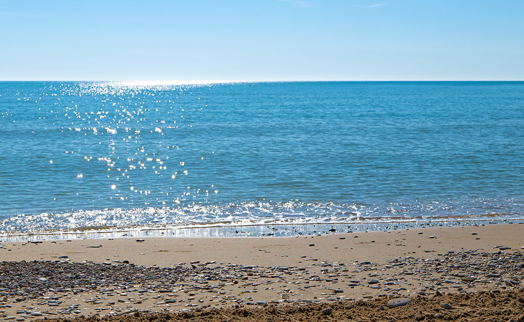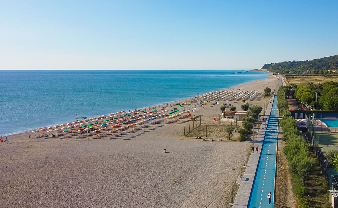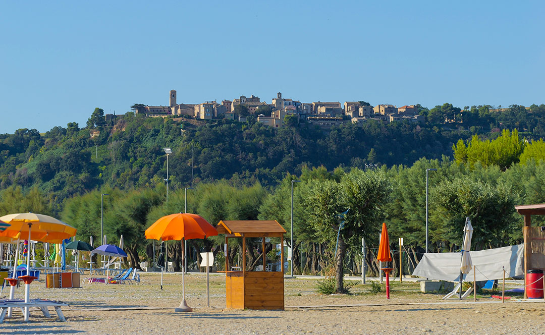 Adiacente al villaggio, la spiaggia è caratterizzata da sassi misti a sabbia. È disponibile sia un tratto di spiaggia libera, sia un lido attrezzato a pagamento. Il mare con fondale basso è perfetto per i bambini.